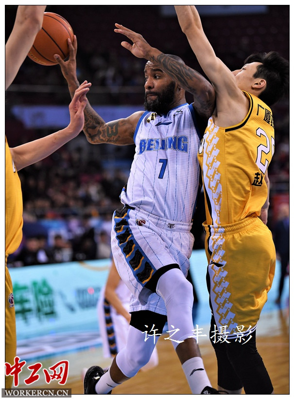 2019年1月18日晚,北京五棵松体育馆,CBA联赛第32轮比赛,北京首钢队主场以120比98战胜浙江广厦队,取得四连胜,同时终结广厦队五连胜。图为双方比赛瞬间。双方比赛数据:北京队杰克逊31分6篮板6助攻3抢断,汉密尔顿27分8篮板2助攻2抢断,翟晓川19分,刘晓宇10分,朱彦西10分,段江鹏9分,方硕6分。广厦队胡金秋22分5篮板,福特森21分6篮板,赵岩昊11分,刘铮18分,孙铭徽11分,博洛西斯10分。工人日报-中工网 许之丰摄影报道