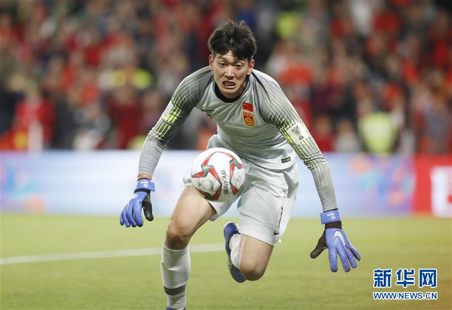 1月20日,中国队守门员颜骏凌在比赛中扑救。 当日,在阿联酋艾因举行的2019年亚洲杯足球赛八分之一决赛中,中国队以2比1战胜泰国队,晋级八强。 新华社记者 丁旭 摄