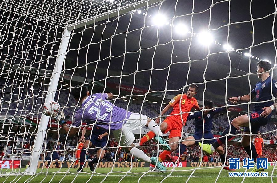 1月20日,中国队球员肖智(中)在比赛中破门得分。 当日,在阿联酋艾因举行的2019年亚洲杯足球赛八分之一决赛中,中国队以2比1战胜泰国队,晋级八强。 新华社记者 曹灿 摄
