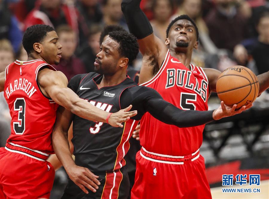 1月19日,热火队球员韦德(中)在比赛中进攻。 当日,在2018-2019赛季NBA常规赛中,迈阿密热火队客场以117比103战胜芝加哥公牛队。 新华社发(乔尔·莱纳摄)