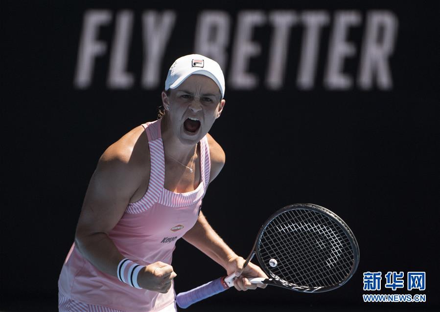 1月20日,巴蒂在比赛中庆祝得分。 当日,在2019澳大利亚网球公开赛女单第四轮比赛中,俄罗斯选手莎拉波娃以1比2不敌澳大利亚选手巴蒂,无缘八强。 新华社记者吕小炜摄