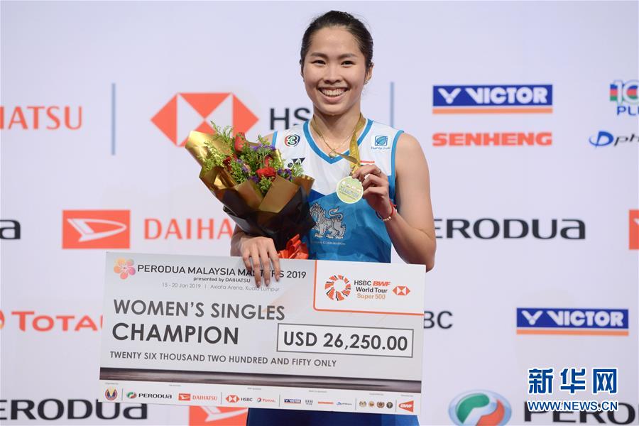 1月20日,因达农在颁奖台上。 当日,在吉隆坡举行的2019马来西亚羽毛球大师赛女单决赛中,泰国选手拉差诺·因达农以2比0战胜西班牙选手马林,获得冠军。 新华社发(张纹综摄)