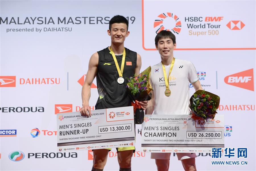 1月20日,孙完虎(右)和谌龙在颁奖台上合影。 当日,在吉隆坡举行的2019马来西亚羽毛球大师赛男单决赛中,韩国选手孙完虎以2比0战胜中国选手谌龙,获得冠军。 新华社发(张纹综摄)