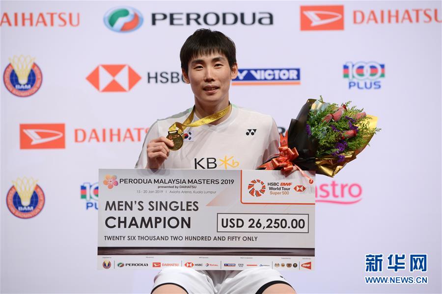 1月20日,孙完虎在颁奖台上。 当日,在吉隆坡举行的2019马来西亚羽毛球大师赛男单决赛中,韩国选手孙完虎以2比0战胜中国选手谌龙,获得冠军。 新华社发(张纹综摄)