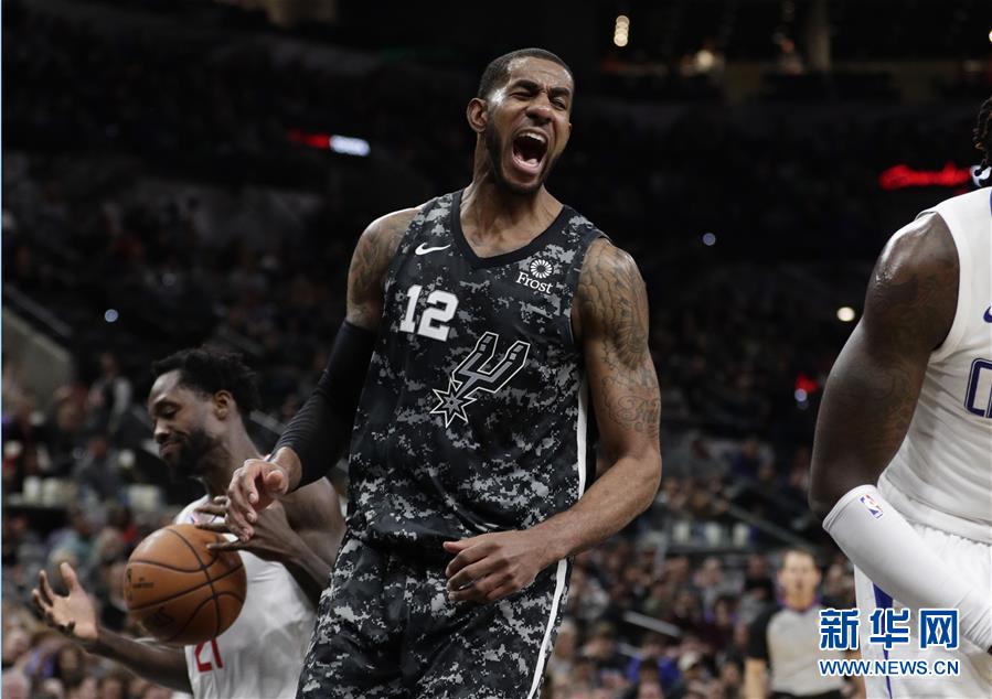 1月20日,马刺队球员阿尔德里奇(中)在比赛中庆祝得分。 当日,在2018-2019赛季NBA常规赛中,圣安东尼奥马刺队主场以95比103不敌洛杉矶快船队。 新华社/美联