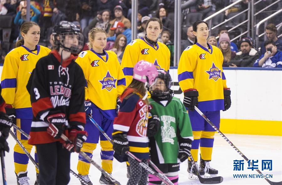 1月20日,全明星金色队球员、深圳昆仑鸿星万科阳光队的王玉婷(右一)在入场仪式中。 当日,2018-2019赛季加拿大女子冰球联赛全明星赛在多伦多进行,来自深圳昆仑鸿星万科阳光队的6名球员分别代表全明星紫色队与金色队参赛。最终,全明星金色队以8比4获胜。 新华社发(邹峥摄)