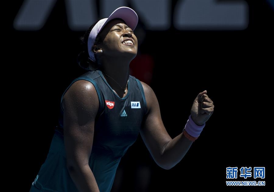 1月21日,日本选手大坂直美庆祝胜利。 当日,在2019澳大利亚网球公开赛女单第四轮比赛中,日本选手大坂直美以2比1战胜拉脱维亚选手塞瓦斯托娃,晋级八强。 新华社记者吕小炜摄