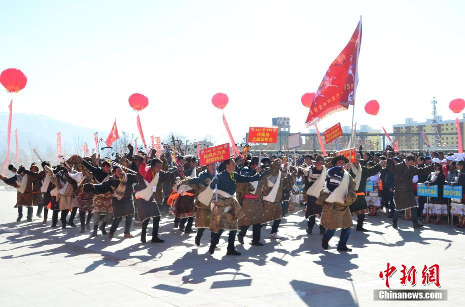 1月21日,在青海省海东市化隆回族自治县举办了2019年化隆县第九届迎新春射箭锦标赛,赛事吸引了各乡镇的119支代表队的1368名运动员前来参赛。图为参赛的射箭队正走向主席台。中新社记者 鲁丹阳 摄