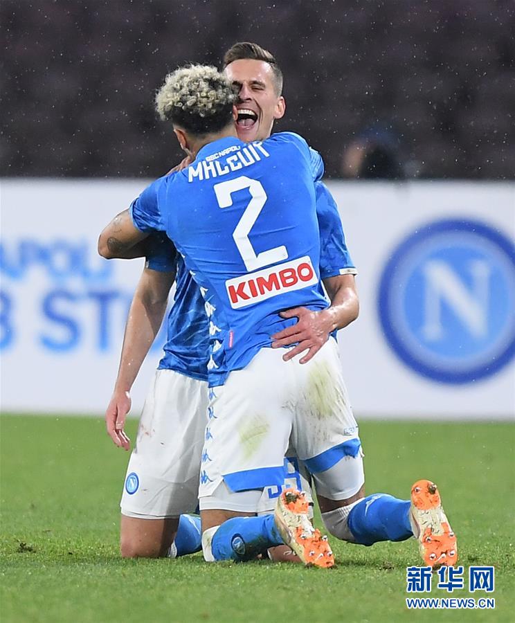那不勒斯队球员米利克(后)在进球后与队友马尔屈拥抱庆祝。 新华社发(阿尔贝托·林格里亚摄)