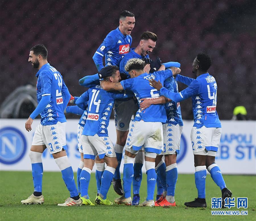 那不勒斯队球员在比赛中庆祝进球。华社发(阿尔贝托·林格里亚摄)