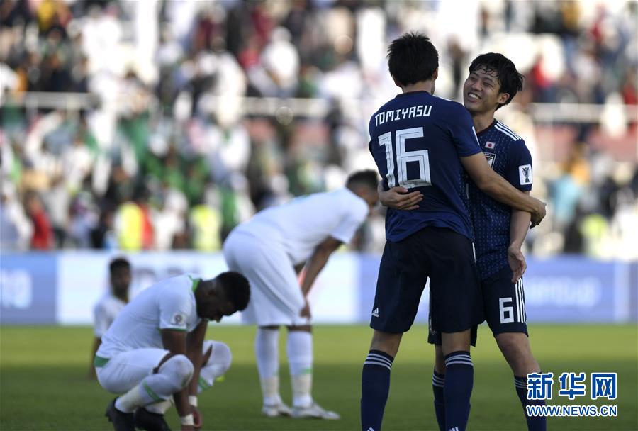 日本队球员远藤航(右一)与队友富安健洋在比赛后拥抱庆祝胜利。新华社记者邬惠我摄