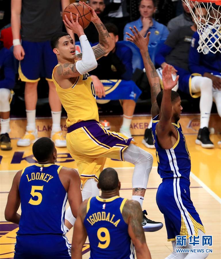 湖人队球员库兹玛(上)在比赛中上篮。 新华社记者李颖摄