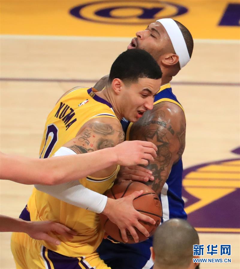 湖人队球员库兹玛(左)在比赛中进攻受阻。新华社记者李颖摄