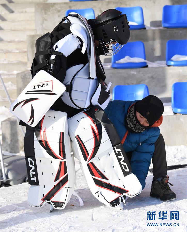 富蕴县小学冰球队守门员李润涛(左)在训练中(2019年1月18日摄)。 新华社记者沙达提摄