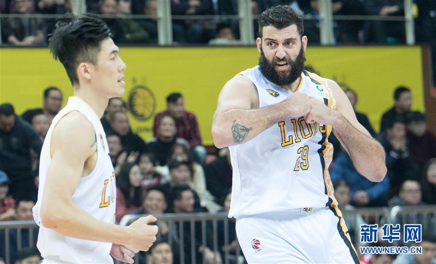 浙江广厦控股队球员博洛西斯(右)在比赛中跟队友交流。新华社记者翁忻旸摄