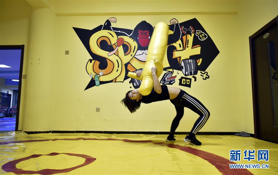 这是1月22日,于萍在工作室里的摔跤垫上和“假人”摔跤,她说只能这样过过瘾了。 新华社记者姚剑锋摄