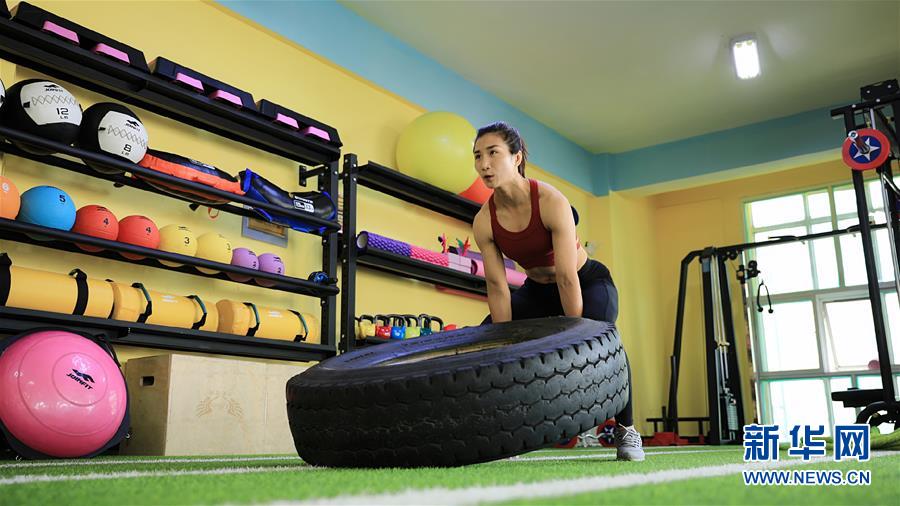 这是于萍在健身工作室里进行翻轮胎训练。在空闲时间,于萍仍会坚持锻炼。(照片由于萍提供) 新华社发