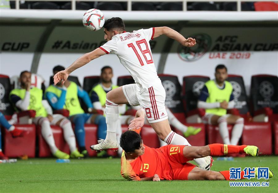 1月24日,伊朗队球员亚汉巴什(上)与中国队球员刘洋在比赛中拼抢。 当日,在阿联酋阿布扎比举行的2019年亚洲杯足球赛四分之一决赛中,中国队以0比3不敌伊朗队,无缘四强。 新华社记者 李钢 摄