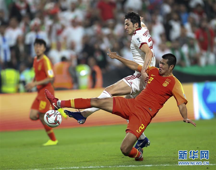1月24日,伊朗队球员阿兹蒙(前左)与中国队球员刘奕鸣(前右)在比赛中拼抢。 新华社记者 曹灿 摄