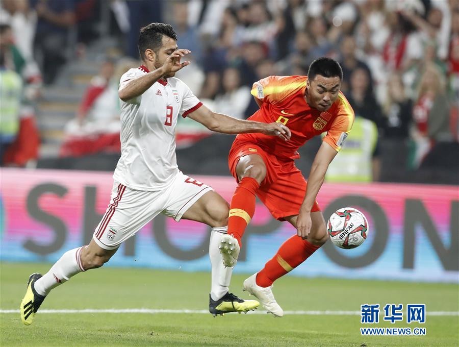 1月24日,中国队球员赵旭日(右)与伊朗队球员普拉利甘吉在比赛中拼抢。新华社记者 丁旭 摄