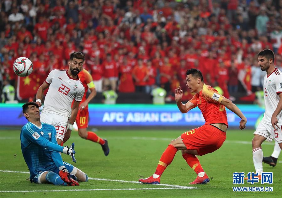 1月24日,中国队球员于大宝(右二)在比赛中射门。 当日,在阿联酋阿布扎比举行的2019年亚洲杯足球赛四分之一决赛中,中国队以0比3不敌伊朗队,无缘四强。 新华社记者 曹灿 摄