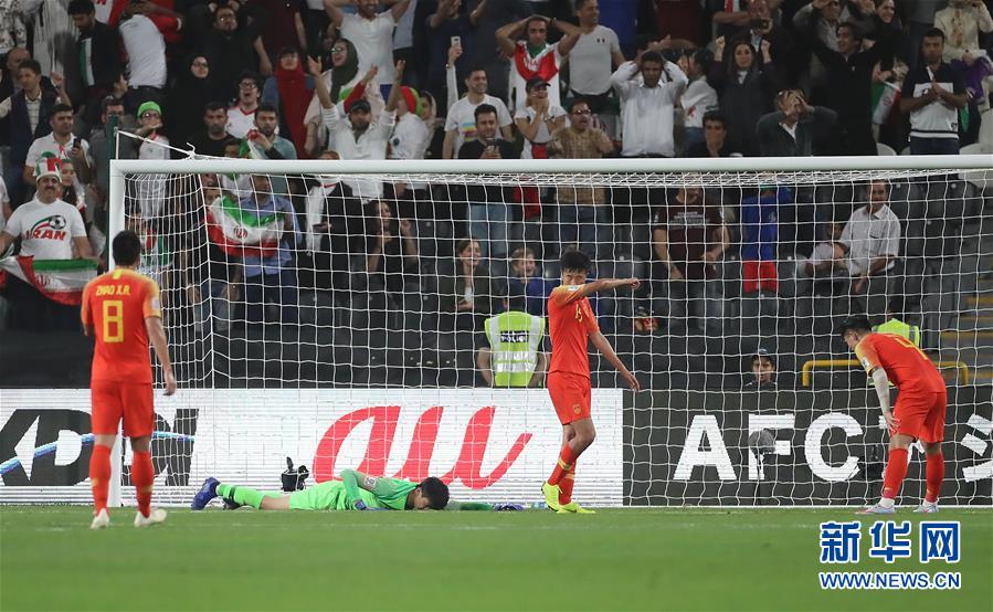 1月24日,中国队球员(从左至右)赵旭日、颜骏凌、刘洋、石柯在比赛中。 当日,在阿联酋阿布扎比举行的2019年亚洲杯足球赛四分之一决赛中,中国队以0比3不敌伊朗队,无缘四强。 新华社记者 曹灿 摄