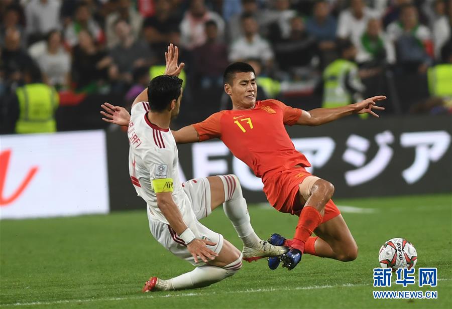1月24日,中国队球员张呈栋(右)与对手在比赛中拼抢。 当日,在阿联酋阿布扎比举行的2019年亚洲杯足球赛四分之一决赛中,中国队以0比3不敌伊朗队,无缘四强。 新华社记者 邬惠我 摄
