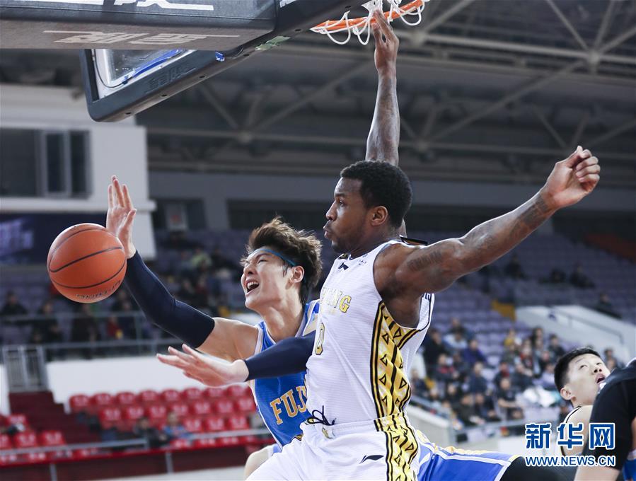 福建晋江文旅队球员王哲林(左)在比赛中进攻受阻。新华社记者孟永民摄