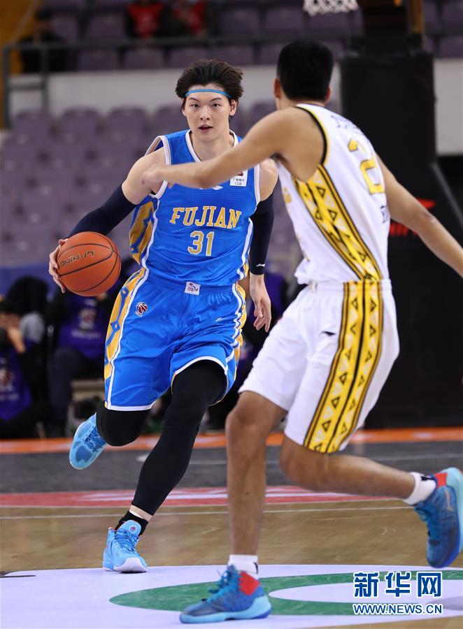 福建晋江文旅队球员王哲林(左)在比赛中进攻。 新华社记者孟永民摄