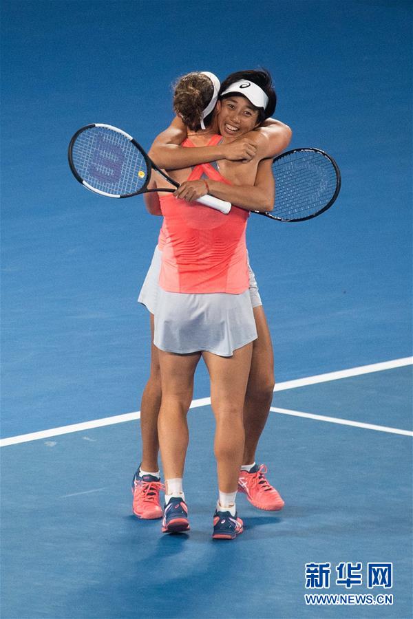 1月23日,张帅(后)/斯托瑟庆祝比赛胜利。 当日,在2019年澳大利亚网球公开赛女双半决赛中,张帅(中国)/斯托瑟(澳大利亚)以2比1战胜捷克组合斯特里科娃/冯德劳绍娃,晋级决赛。 新华社发(白雪摄)
