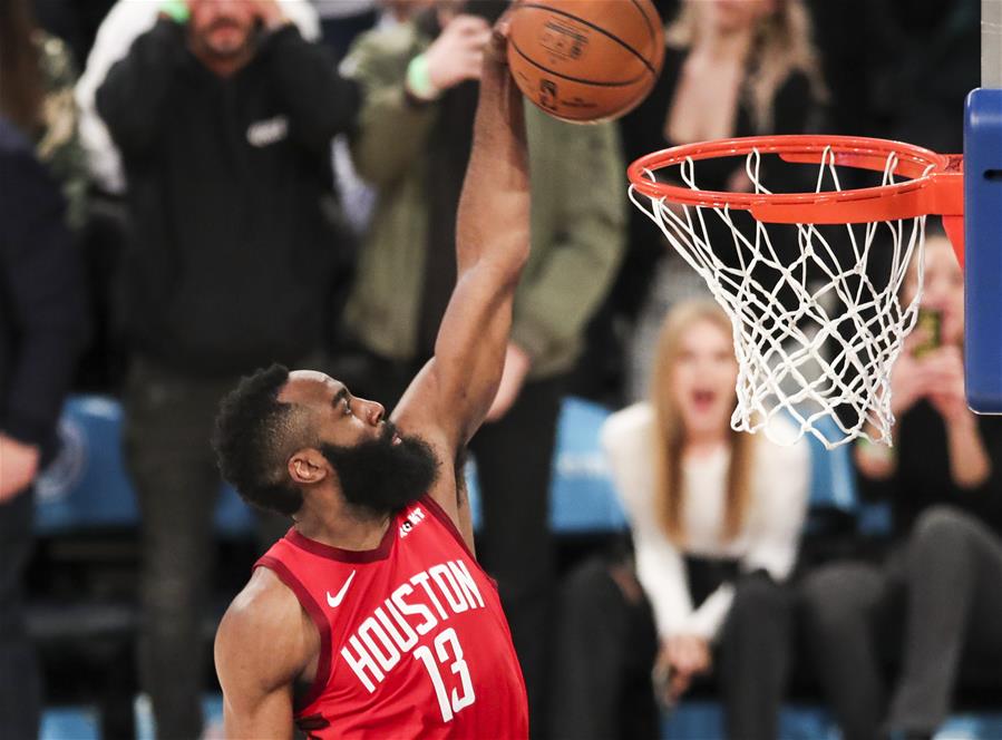 1月23日,火箭队球员哈登在比赛中扣篮。 当日,在2018-2019赛季NBA常规赛中,休斯敦火箭队客场以114比110战胜纽约尼克斯队。 新华社记者王迎摄