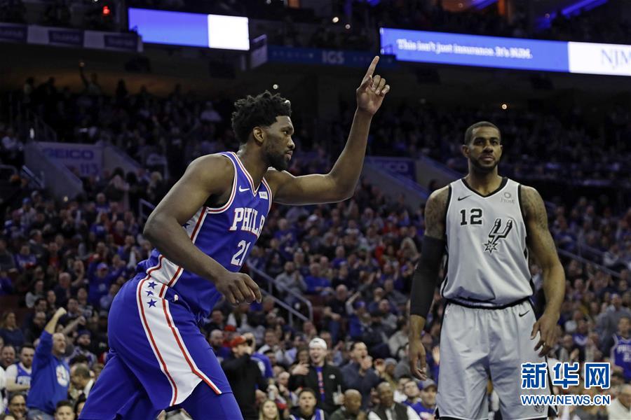 1月23日,76人队球员恩比德(左)在比赛中庆祝得分。 当日,在2018-2019赛季NBA常规赛中,费城76人队主场以122比120战胜圣安东尼奥马刺队。 新华社/美联