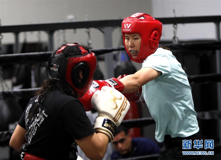 1月23日,中国拳击队队员张荣(右)在70公斤级比赛中。 当日,中国国家拳击队在美国休斯敦和当地拳击选手进行训练比赛。近日,中国国家拳击队分别在美国科罗拉多州和得克萨斯州的休斯敦市进行训练,备战2020年东京奥运会。 新华社发(宋穹摄)