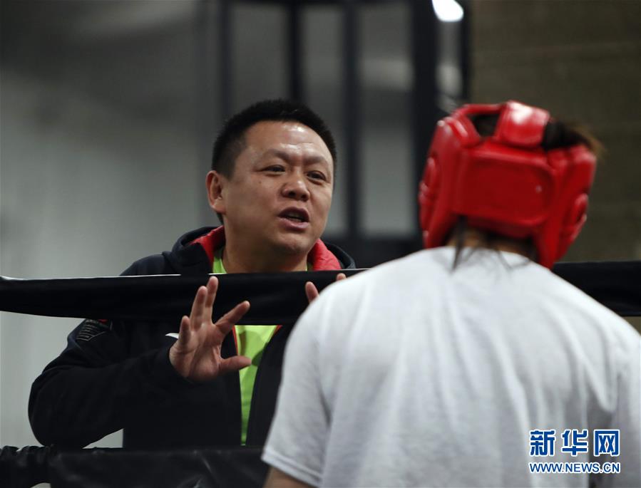 中国女子拳击队教练王润强(左)在比赛间隙向队员布置战术。新华社发(宋穹摄)