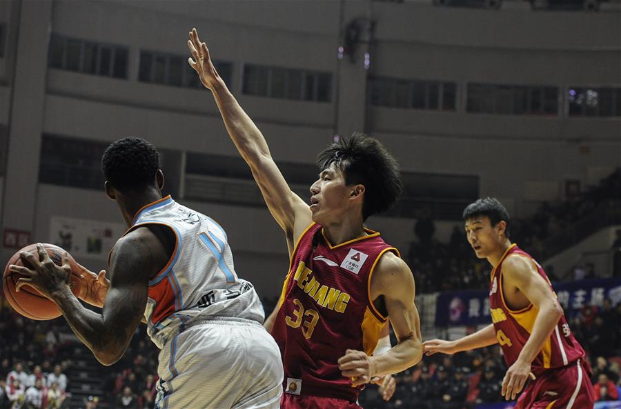 1月24日,浙江稠州银行队球员吴前(中)在比赛中防守新疆广汇汽车队球员亚当斯。 当日,在2018-2019赛季中国男子篮球职业联赛(CBA)常规赛第35轮比赛中,新疆广汇汽车队主场以118比116战胜浙江稠州银行队。 新华社记者王菲摄
