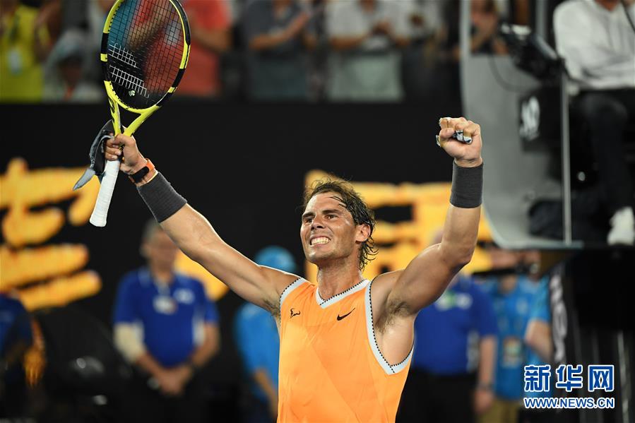 1月24日,纳达尔庆祝胜利。 当日,在2019澳大利亚网球公开赛男单半决赛中,西班牙选手纳达尔以3比0战胜希腊选手西西帕斯,晋级决赛。 新华社记者吕小炜摄