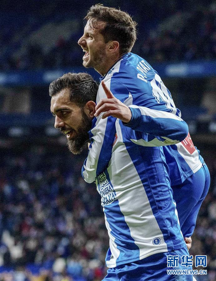 西班牙人队球员伊格莱西亚斯(左)在比赛中和队友皮亚蒂庆祝进球。新华社发(胡安·戈萨摄)