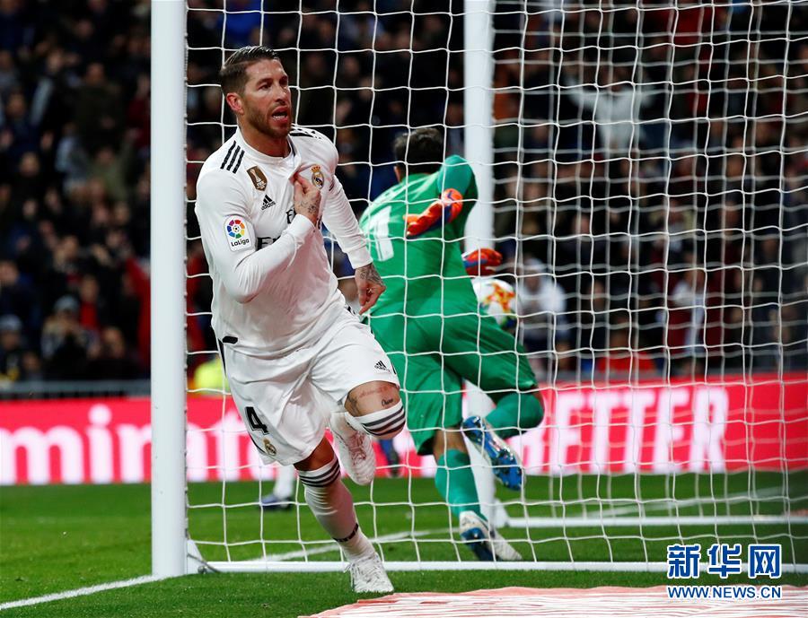 皇家马德里队球员拉莫斯在比赛中庆祝进球。新华社/路透