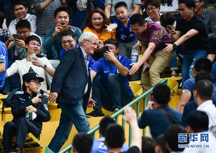 这是2018年3月18日,中国国家队主教练里皮在2018赛季中超联赛第3轮广州富力主场迎战上海上港队的比赛中,来到现场观赛。 新华社记者刘大伟摄