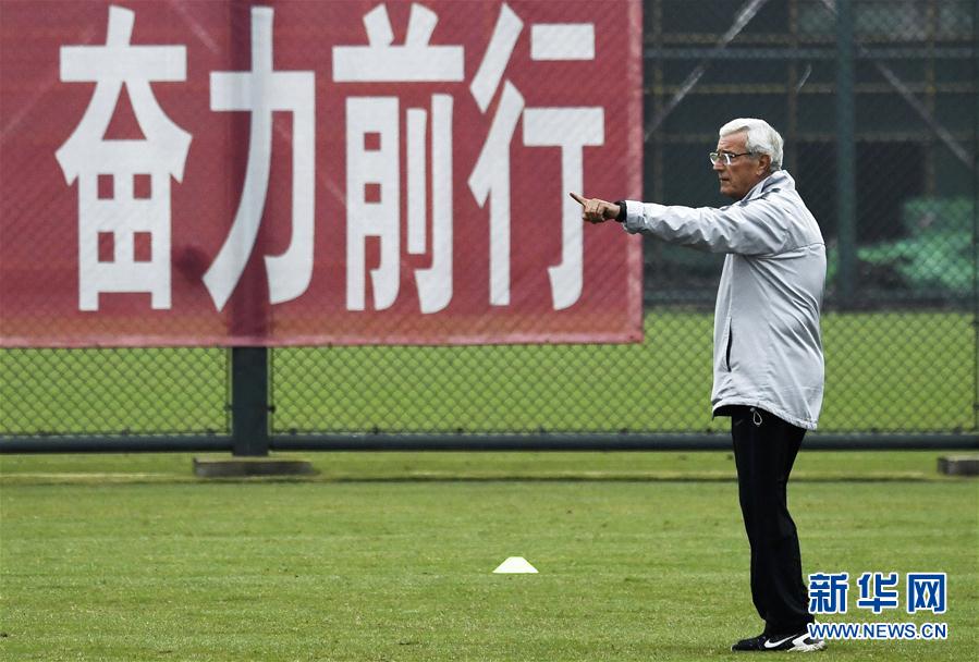 2018年12月13日,中国男足继续在海口集训备战即将到来的亚洲杯比赛。这是中国队主教练里皮指挥队员训练。 新华社记者杨冠宇摄
