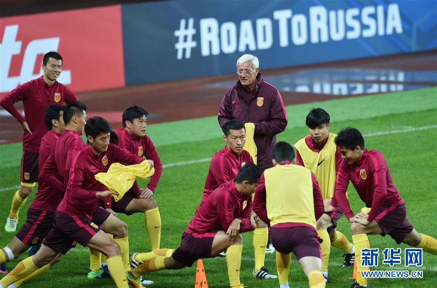 2016年11月14日,中国男足在昆明市拓东体育场训练,备战次日与卡塔尔队的俄罗斯世界杯亚洲区预选赛。这是中国男足主教练里皮(后排中)观察球员训练。 新华社记者蔺以光摄