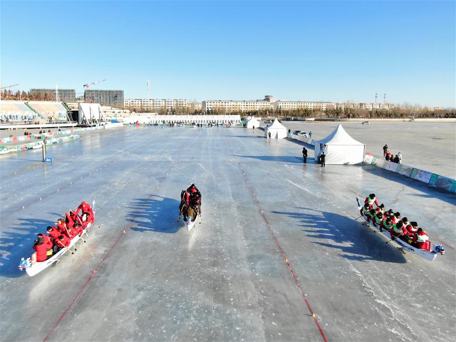 1月25日,选手队伍在冰上龙舟测试赛中(无人机拍摄)。 2019“多伦诺尔杯”全国第十四届冬季运动会冰上龙舟项目测试赛1月24日至25日在内蒙古自治区多伦县举行,共有来自全国30余支代表队500余名运动员参赛。 新华社记者邹予摄