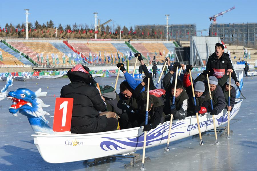 1月25日,辽宁锦州队在青年组12人龙舟100米直道赛第三轮比赛中。 2019“多伦诺尔杯”全国第十四届冬季运动会冰上龙舟项目测试赛1月24日至25日在内蒙古自治区多伦县举行,共有来自全国30余支代表队500余名运动员参赛。 新华社记者邹予摄
