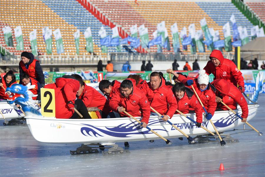 1月25日,多伦县白音部落队在混合组12人龙舟100米直道赛B组决赛中。 2019“多伦诺尔杯”全国第十四届冬季运动会冰上龙舟项目测试赛1月24日至25日在内蒙古自治区多伦县举行,共有来自全国30余支代表队500余名运动员参赛。 新华社记者邹予摄