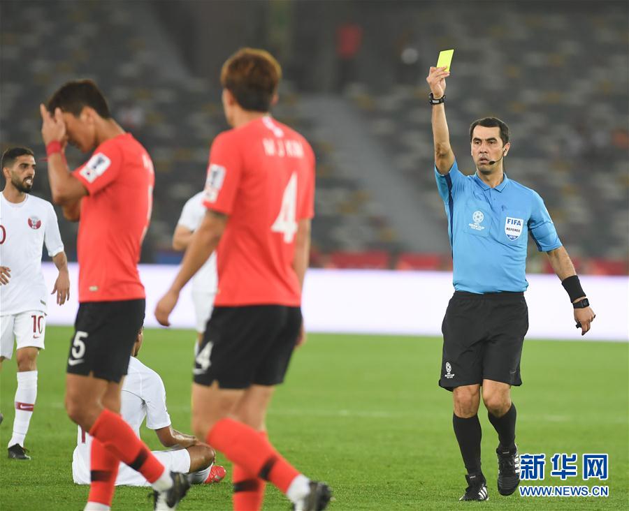 1月25日,主裁判向韩国队球员郑又荣(左二)出示黄牌。 当日,在阿联酋阿布扎比举行的2019年亚洲杯足球赛四分之一决赛中,韩国队以0比1不敌卡塔尔队,无缘半决赛。 新华社记者邬惠我摄