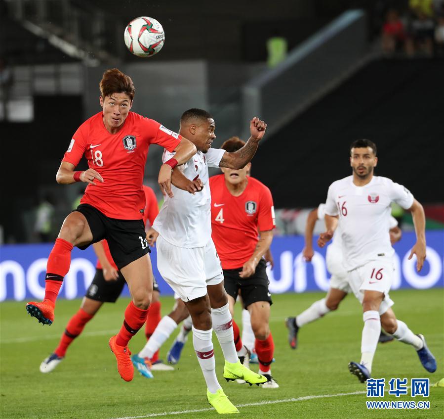 1月25日,韩国队球员黄义助(左一)在比赛中争顶头球。 当日,在阿联酋阿布扎比举行的2019年亚洲杯足球赛四分之一决赛中,韩国队以0比1不敌卡塔尔队,无缘半决赛。 新华社记者李钢摄