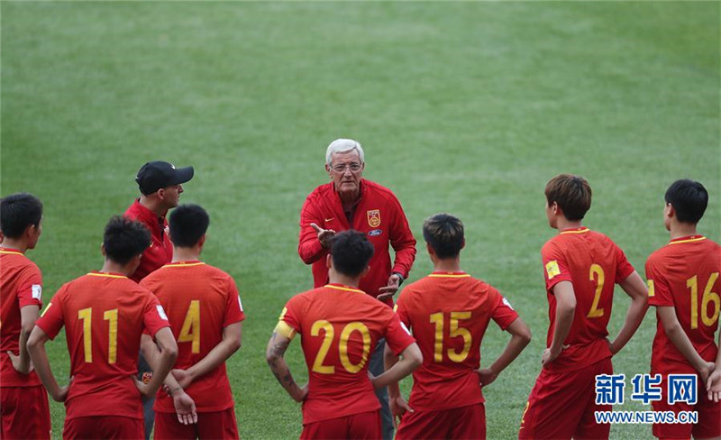 2017年5月17日,中国男足二队主教练里皮(中)在一场教学比赛中场休息时向队员布置战术。 新华社记者曹灿摄