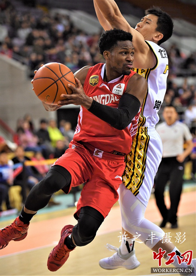 2019年1月27日晚,北京奥体中心篮球馆,CBA联赛第36轮比赛,北京农商银行队主场以102比117负于青岛队,这是北京农商行队连续第12场告负,目前排名第20位。图为双方的比赛瞬间。工人日报-中工网 许之丰摄影报道