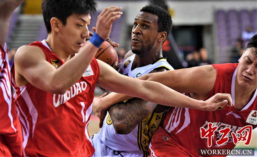 2019年1月27日晚,北京奥体中心篮球馆,CBA联赛第36轮比赛,北京农商银行队主场以102比117负于青岛队,这是北京农商行队连续第12场告负,目前排名第20位。图为双方的比赛瞬间。工人日报-中工网 许之丰摄影报道