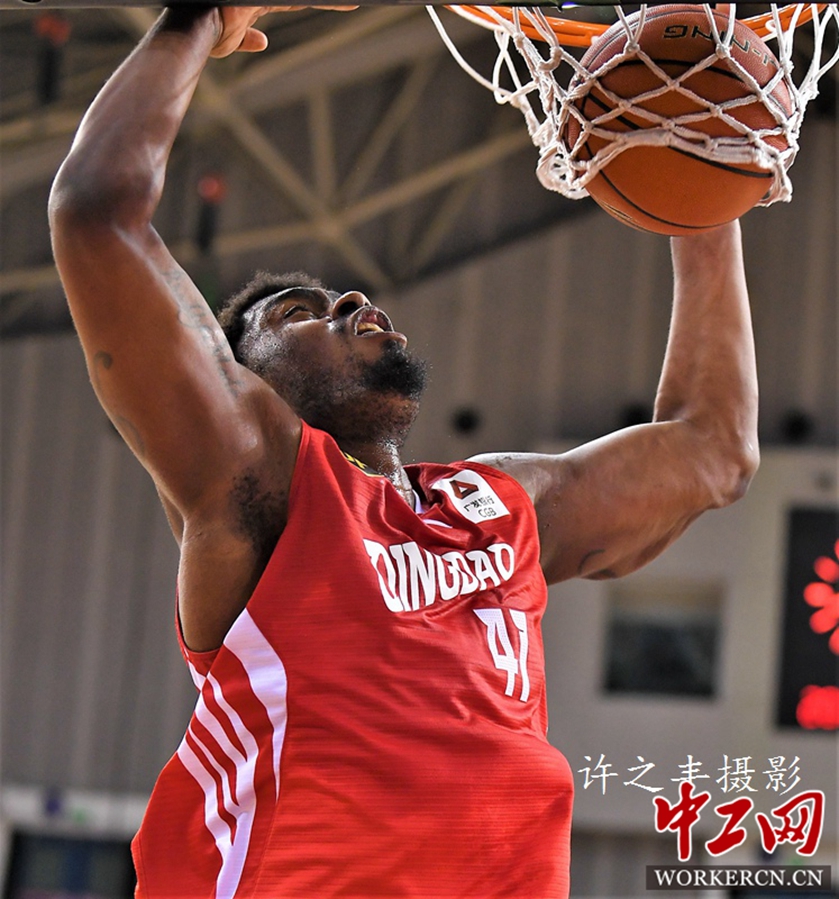 2019年1月27日晚,北京奥体中心篮球馆,CBA联赛第36轮比赛,北京农商银行队主场以102比117负于青岛队,这是北京农商行队连续第12场告负,目前排名第20位。图为双方的比赛瞬间。工人日报-中工网 许之丰摄影报道